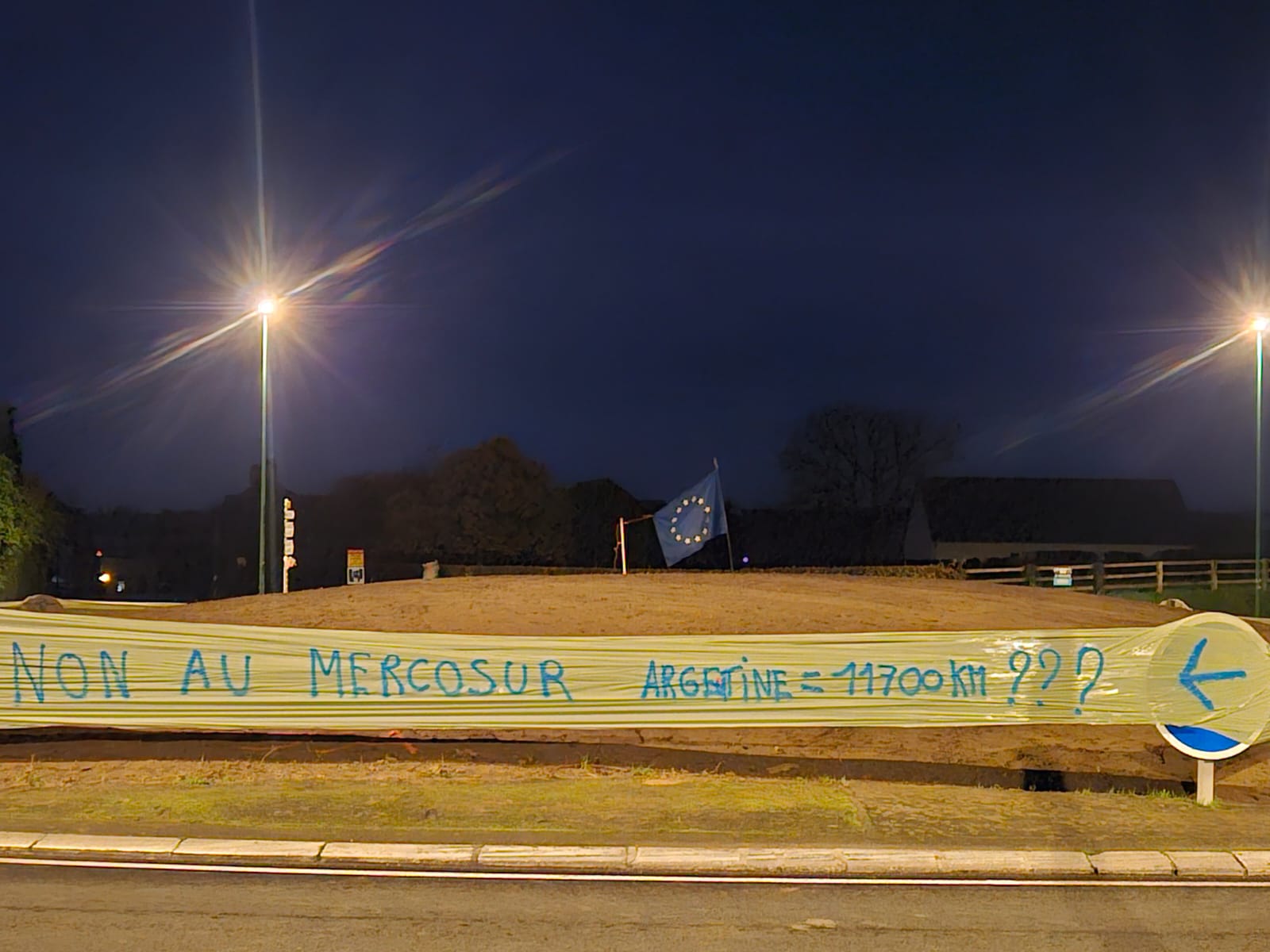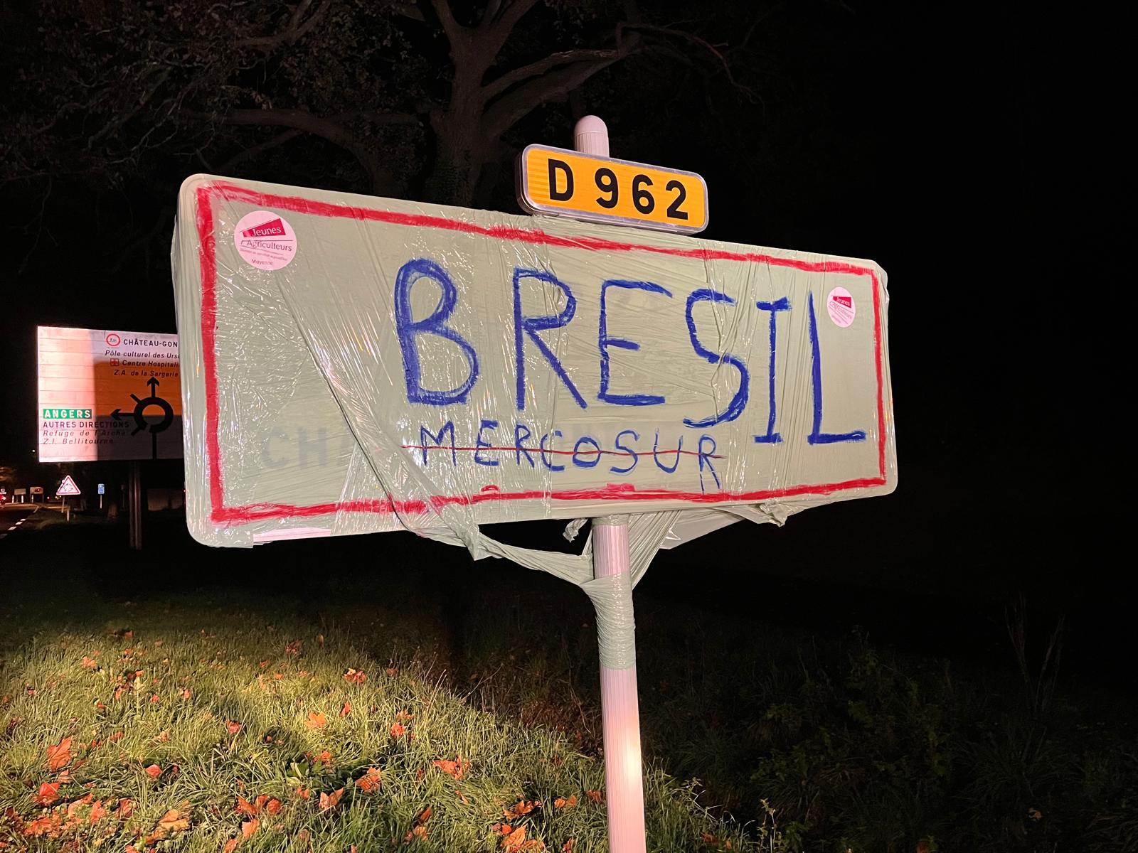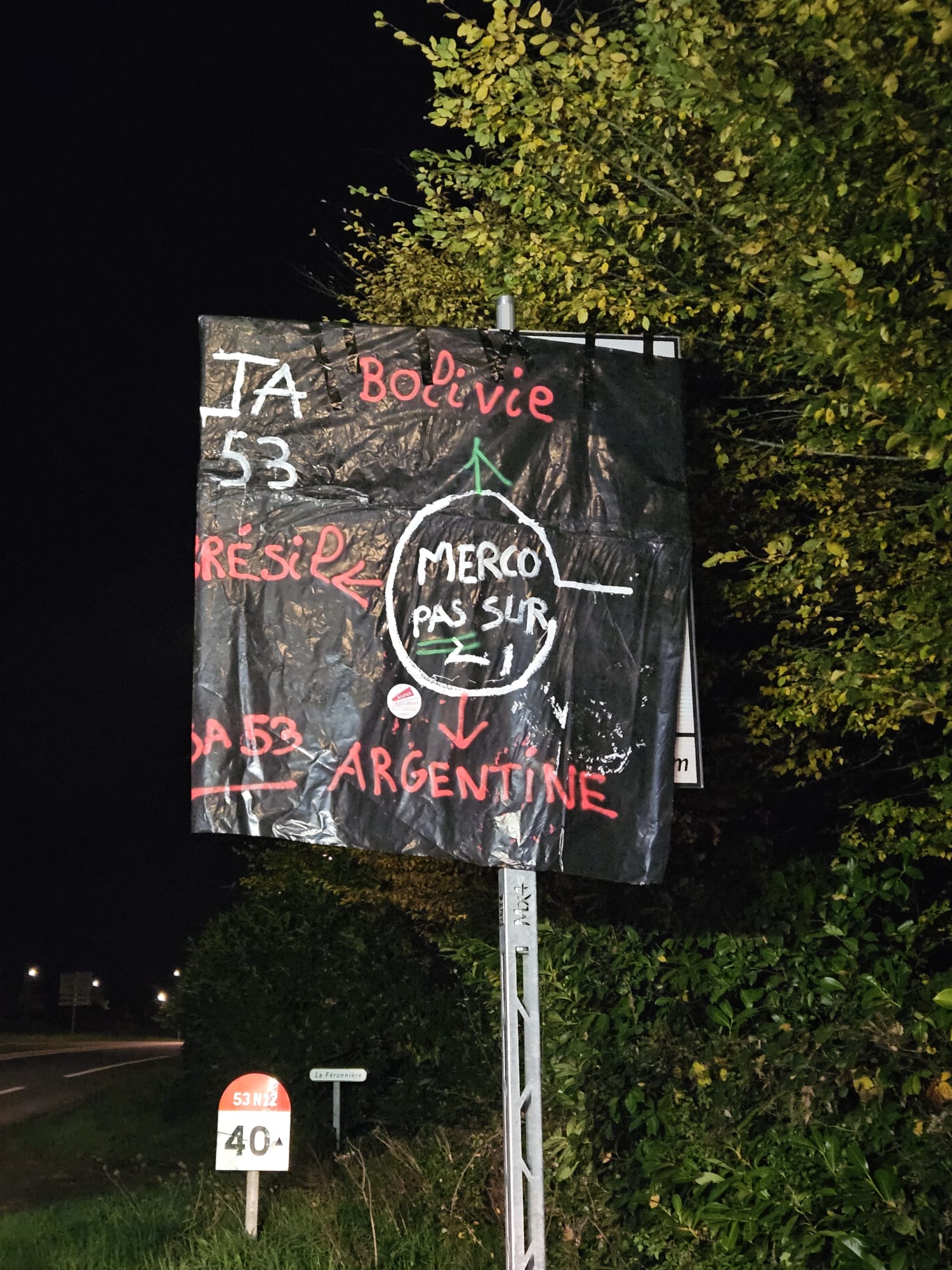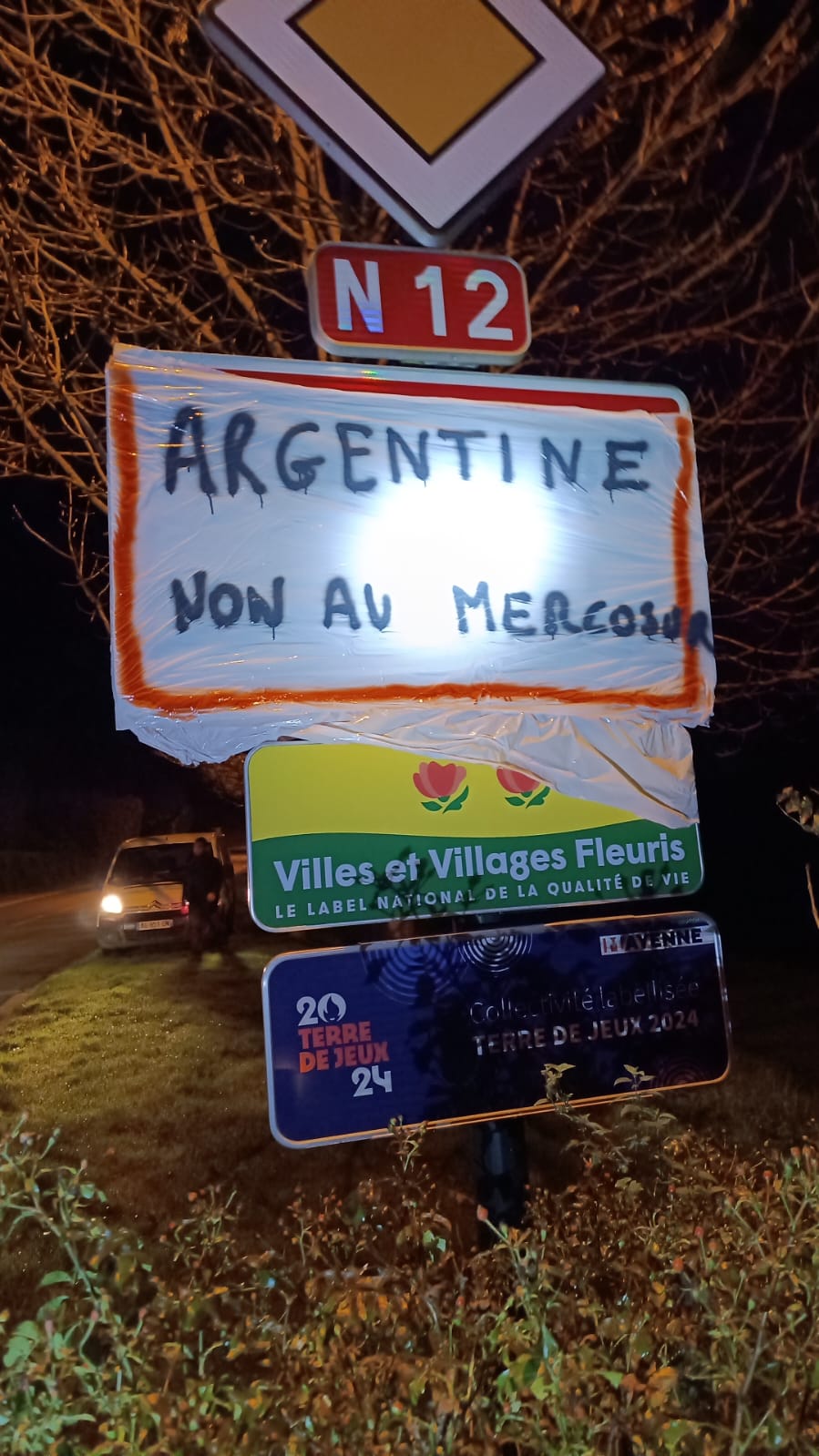 Dans la nuit du dimanche 17 novembre 2024, plus de 60 agriculteurs des Jeunes Agriculteurs de la Mayenne et de la FDSEA de la Mayenne ont bùché les panneaux des communes et ont inscrit les noms des villes ou pays du Mercosur.