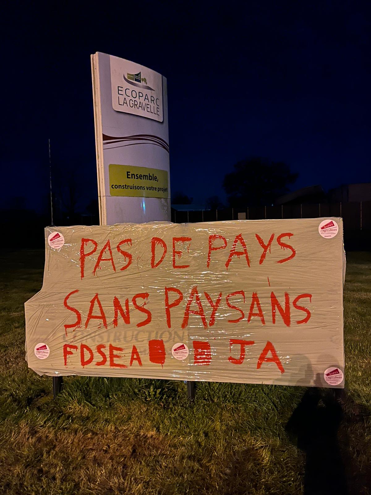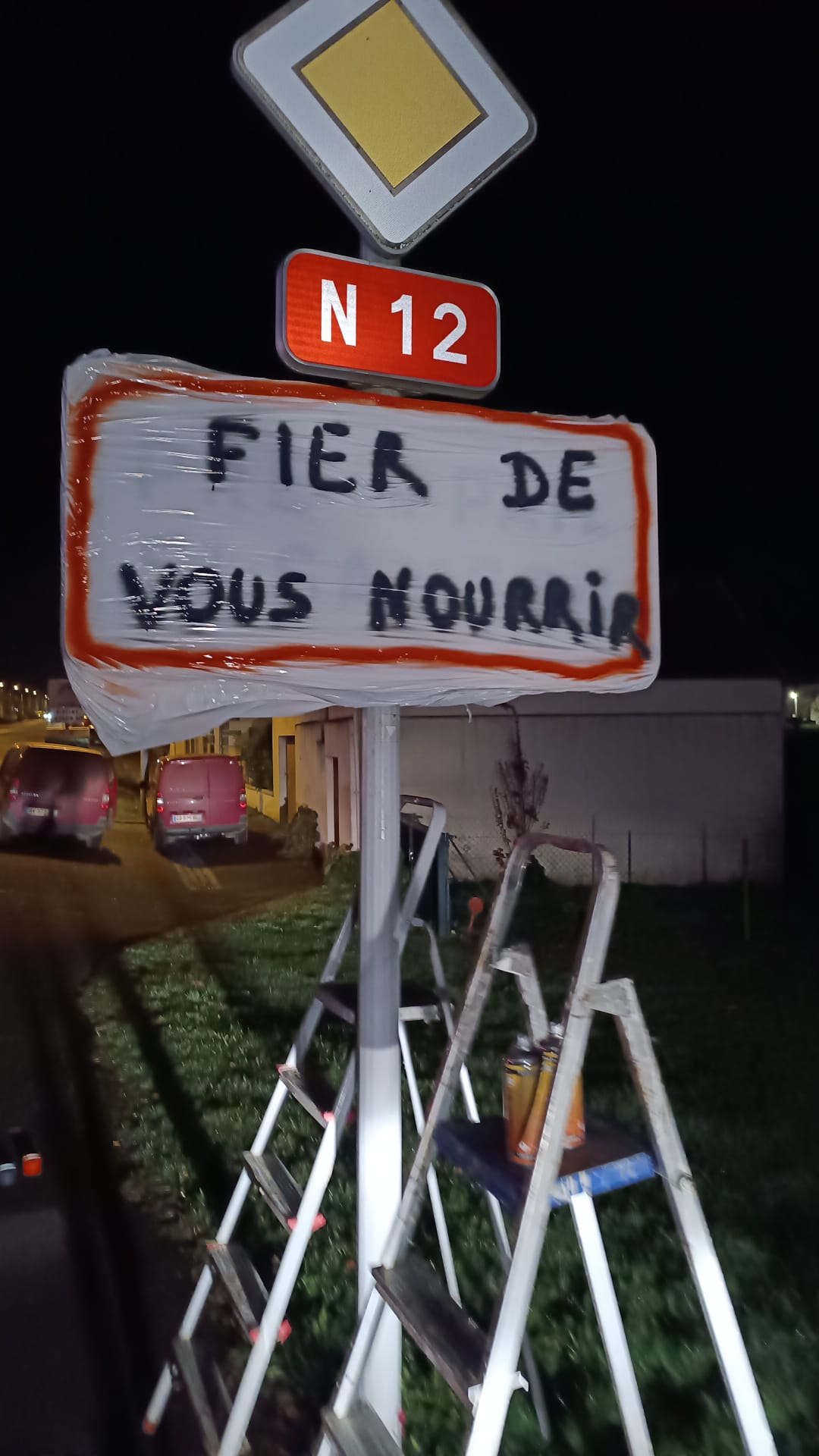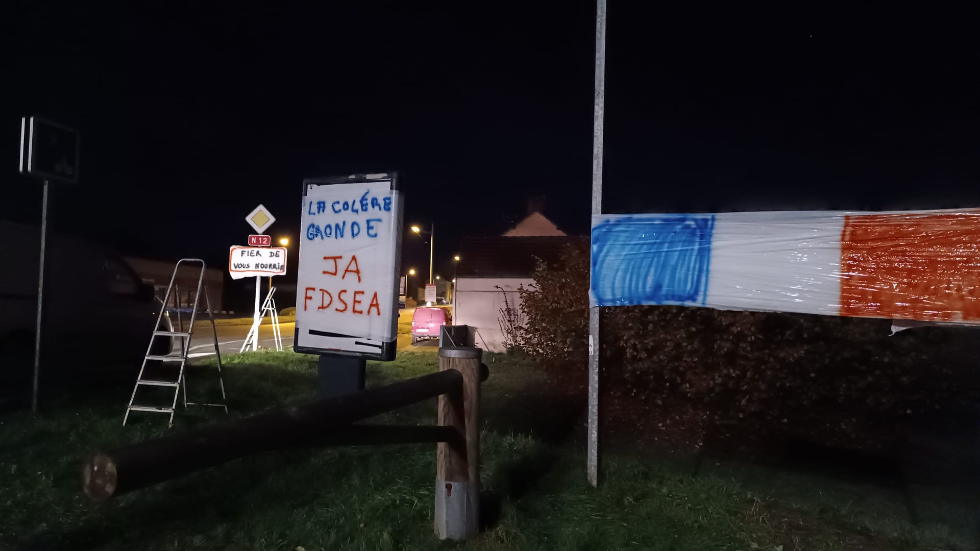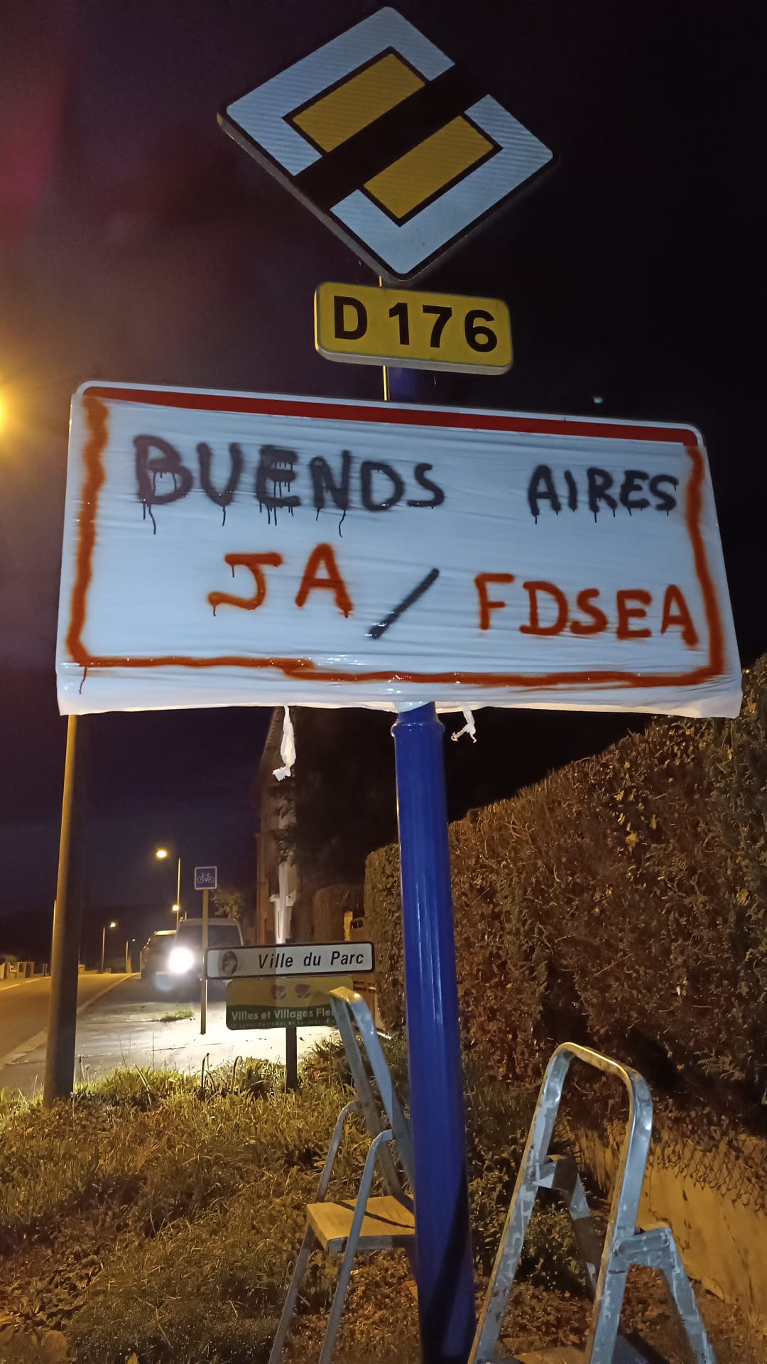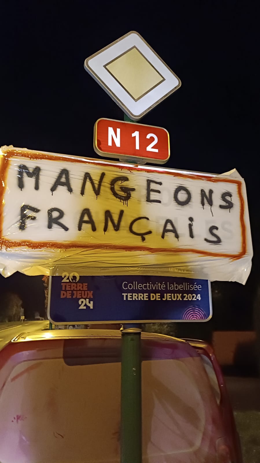 Dans la nuit du dimanche 17 novembre 2024, plus de 60 agriculteurs des Jeunes Agriculteurs de la Mayenne et de la FDSEA de la Mayenne ont bùché les panneaux des communes et ont inscrit les noms des villes ou pays du Mercosur.